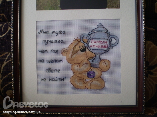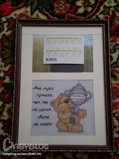 Мужа спрятала  нечего любоваться)))) Мне нравится и вышивка, и оформление! И очень хорошая идея с фотографией в рамку вставить!
