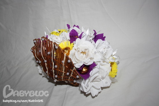 Девочки, делала ракушку с белыми розами и "яркими пятнами" , чего то она мне не понравилась, но никак не могла сообразить как исправить и разобрала совсем - из роз сделала корзинку (добавила зелени), а "пятна" так и остались))) Но вопрос остался открытым... Поделитесь мнением что можно было сделать или вообще неудачное сочетание .