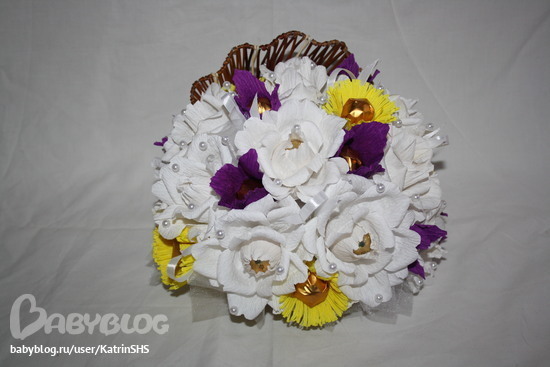 Кстати про пленку золотую тебе рассказывала (что типа на полисилк похожа), сначала она мне тонкой показалась, а на самом деле нет, вот ей конфетки в этом букете обернула и чего то не айс)))