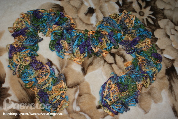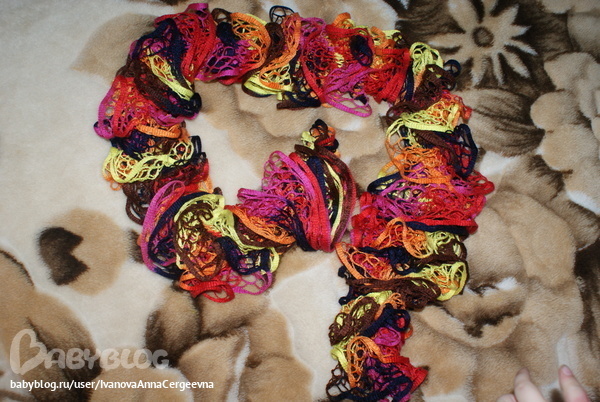 здравствуйте!!подскажите,пожалуйста,вы провязывали каждую петельку или через одну.дело в том что я тоже вяжу такой же шарфик,на 7 петелек,провязывая каждую петлю и у меня с мотка получается чуть ли не 2-х метровый,хотя когда покупала нитки мне сказали,что с мотка получится метровый.может я что то не так делаю?