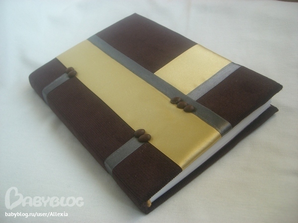 Блокнот формата А5 выполнен полностью с нуля. Обложка - вельвет и атласные ленты, декорировала зернами кофе. Листы линованные.