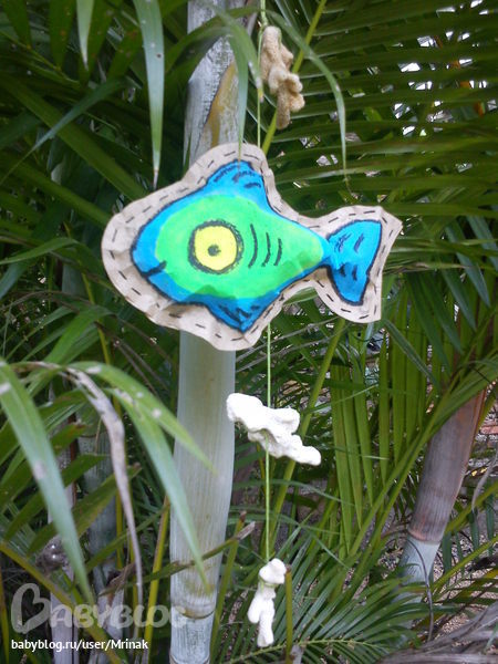 Объемная двухсторонняя, нарисована на крафте светящимися в темноте красками, внутри набита бумагой, кораллы грузики.