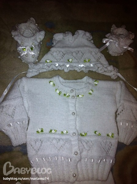 спасибо! к сожалению костюмчик уже отдала. вязала по самым маленьким .распашонке, ползункам и чепчику.но все равно все оказалось"слегка на вырост" . чепчик обхват головы(вокруг лица)-24 см, "глубина-10 см, ползунки: длина 34, обхват "талии"-40 см; кофточка: длина-24см, обхват груди-46, длина рукава( от выреза горловины)-20 см.