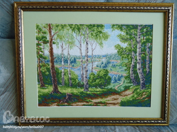 Забрала, вчера рамку из багетки. Натягивала сама, нашим мастерам не доверяю. Единственное что разочаровало - это то, что они паспарту сделали буквально на 2 мм больше, чем я просила и поэтому немного выглядывает канва. Хотела я заказать темно-зеленый цвет паспарту, но у них кроме зеленого, вообще больше ничего нет. Но вроде и так пойдет. А вам как кажется, нужно мне перекрашивать паспарту в темно-зеленый или оставить так?