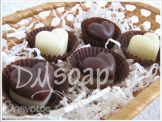 Состав: масло какао, масло манго, масло ши (карите), масло кокоса, масло миндальное, масло виноградной косточки, полавакс. Светлые - с эфирным маслом жасмина. Темные - в светлой части отдушка ваниль, в темной части тертое какао и отдушка шоколад.