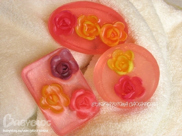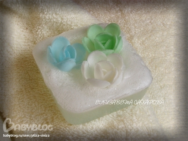 Очень красиво. Мне с цветочками нравятся. А мигрировать цвета не будут? Там же пищевые красители. Уже делали такое мыльце? Я почему спрашиваю - с крахмальными цветочками я не пробовала делать, делала с мыльными розами - такое красивое получилось мыльце, а потом будто бы на свету выгорело, все побледнело. Я заливала сиреневые розы - прозрачной основой - потом розы получились серые.