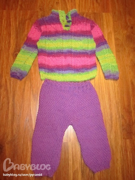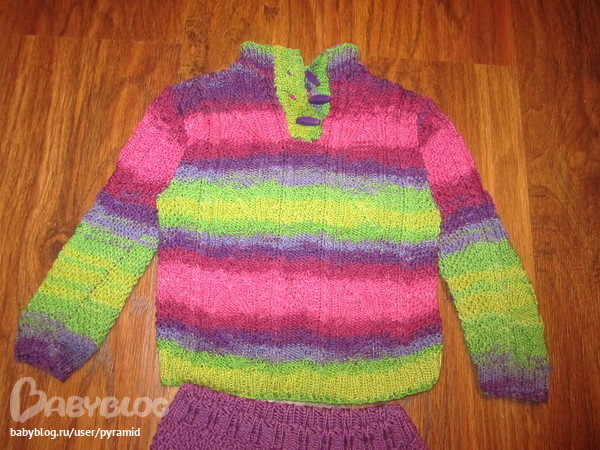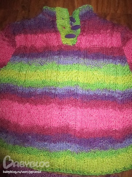 Сколько петель набирала уже не помню (делала на глаз), мы начали её носить еще в 9мес и сейчас она хорошо, у меня был один моток Alize diva batik (микрофибра, 350 м.), вот он весь полностью и ушел, на окантовку пройм не хватило. Пряжей довольна, прекрасно выстирываеться и устойчива к возникновению катышек, расцветка не поблекла. И вверху свитер тоже из той же серии, только цвет другой. Основное полотно - изнаночные петли, узор простейший - жгут