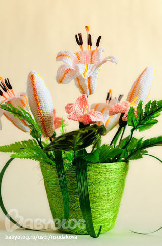 Вязала цветы, надевала их на стебли с серединками и втыкала в пенопласт, который приклеен к днищу горшочка. В нераскравшихся бутонах тоже пенопласт, вырезаный по форме бутона и надетый на герберную проволоку. Все ножки цветов - проволка, обмотанная тейп-лентой. Листья лилий - это лента "аспидистра", ее просто вырезала нужной длины и придала ей форму листа. Схему цветков надо нарисовать, так как это перереботанная мною схема похожего цветка, который есть в журнале. Обещаю, скоро сделаю мастер-класс по изготовлению таких лилий.