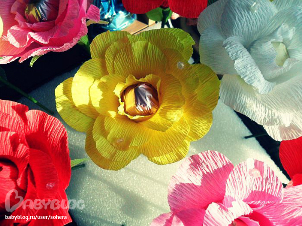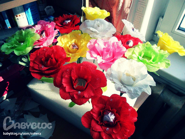 И последнее: букеты из конфет-это не цветы, это УПАКОВКА конфет в виде цветка:-)