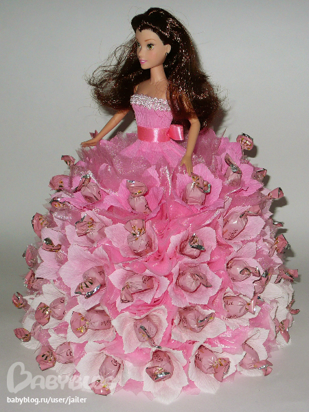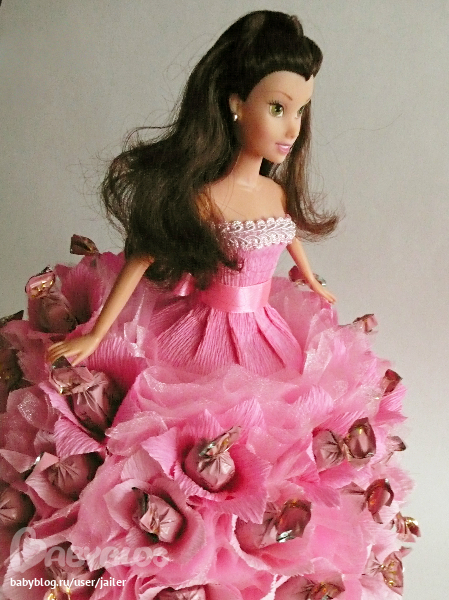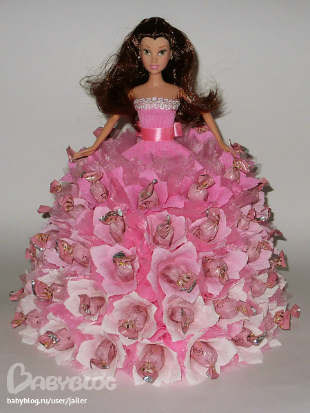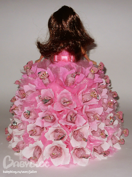 "Бесконечная" кукла (2 раза бегала за конфетами, в итоге "истратила" на нее 3,5 коробки Гейши, и в 3 подхода резала фунтики) - бооооольшая дамочка получилась (по фото не очень заметно):