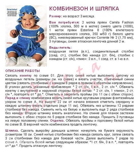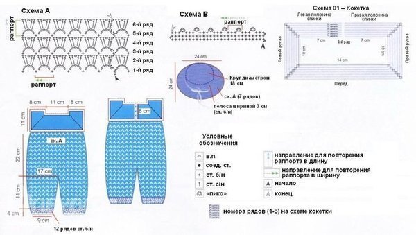 Весь комбинезон вяжется, как одна деталь... Начинаем вязать с кокетки-реглан (чертеж есть в описании) прибавляя на уголках столбики (на моем фото видно), в конце подмышками я добавила кажется 10 воздушных петель, ну и вяжется так дальше вниз, между ногами тоже добавляются воздушные петли