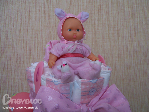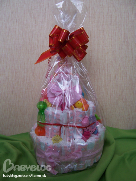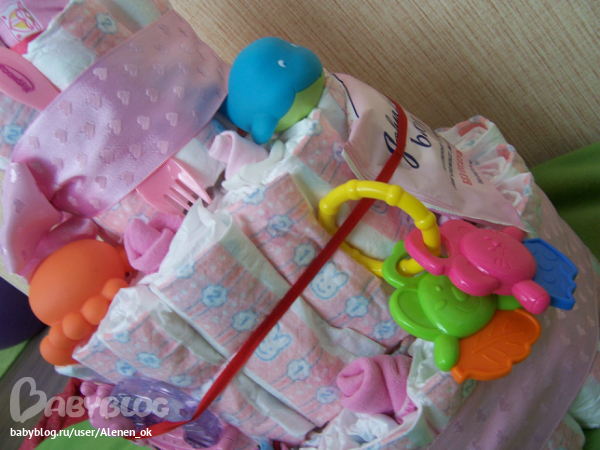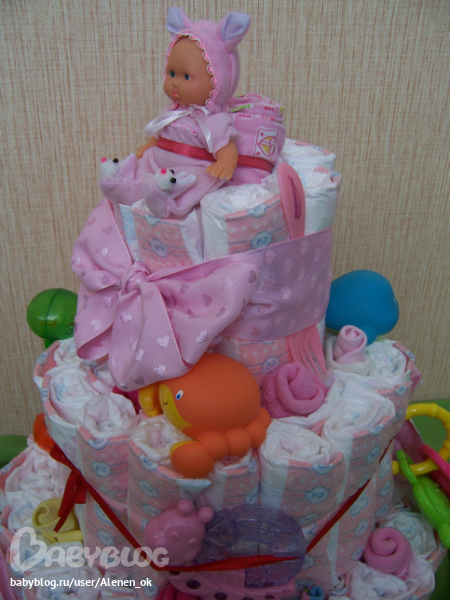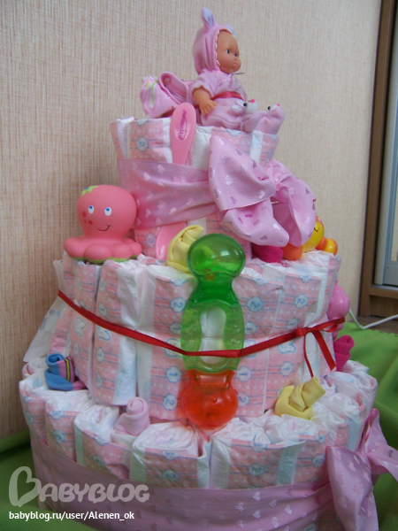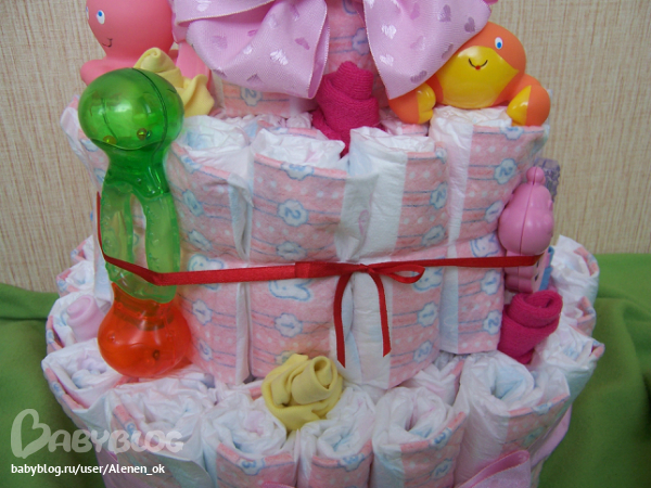 Я бы если сделала, выложила бы веером по кругу, не сворачивая! Терпеть не могла использовать памперсы, которые были до этого свернуты, поэтому всегда относила скептически к таким подаркам,по мне лучше взаять упаковку не вскрытую и ее оформить, хотя тортик смотрится действительно красиво и нарядно.