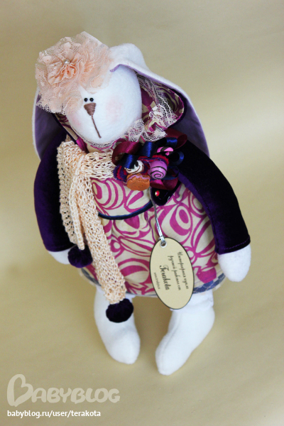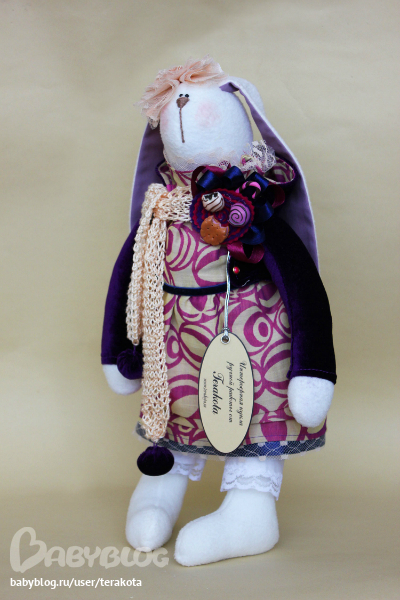 Еще вчера обратила внимание на ваши работы, но не было времени оставить комментарий. Сегодня я уж не промолчу) Все очень красиво и аккуратно сделано, но больше всего меня впечатлило, то как подобранна цветовая гамма в игрушках - изыскано, глубокие и сложные цвета, запоминается, так как в основном у всех или яркие краски или пастель. И эта зайка - тому подтверждение! Мне нравиться!