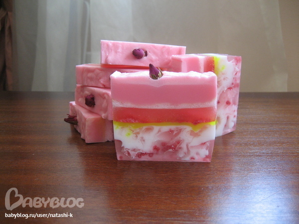 Основы прозрачная, органическая и белая, масло персиковое, масло авокадо, бисер для ванны, бутоны розы. Частично взбитое. Пахнет спелой дыней с оттенком малины!!! Мммм........