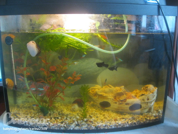 А мой сейчас пустой стоит....последние поселенцы сгинули.... 3 года жили,жили...и "+" (доча "помошница покормила....мне ничего не сказала...а аквариум стоит в моей комнате , но я в ней редко тусю..., завалена она стир., но неглаж. бельём=))), короче корм разбух, фильтр был отключен, кто-то пользовался розеткой, забыл включить....и .....когда я поняла, что случилось, было поздно