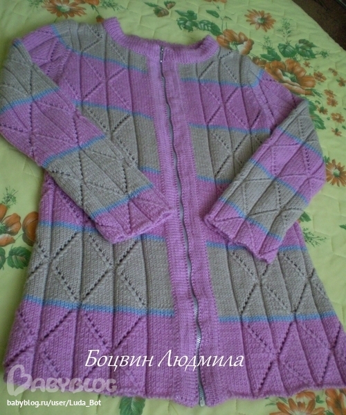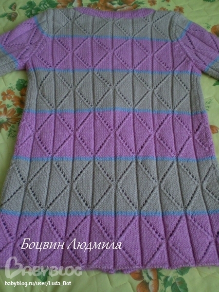 Спасибо,Людмила! эту кофту связала себе. Пряжа розовая и серая - 100% шерсть, голубая - 50% шерсти и 50% акрила.