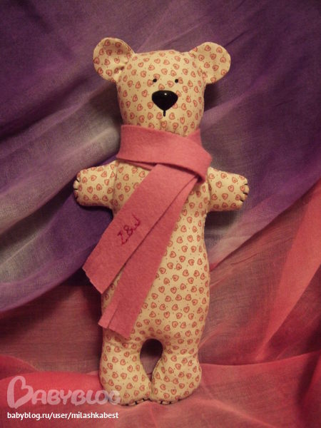Немного о мишке - рост 25 см, ткань хлопок, шарфик из 100% шерстяного фетра, буквы на шарфике моя любимая машинка сделала:)