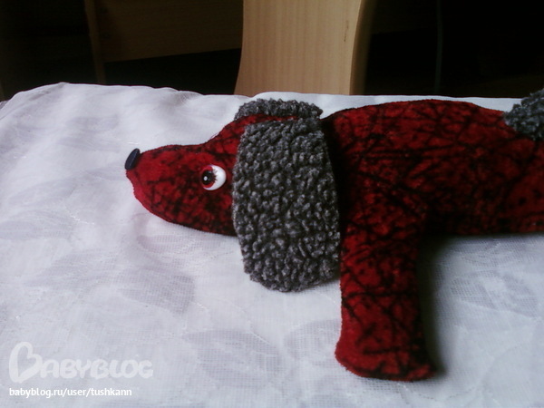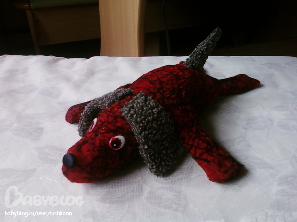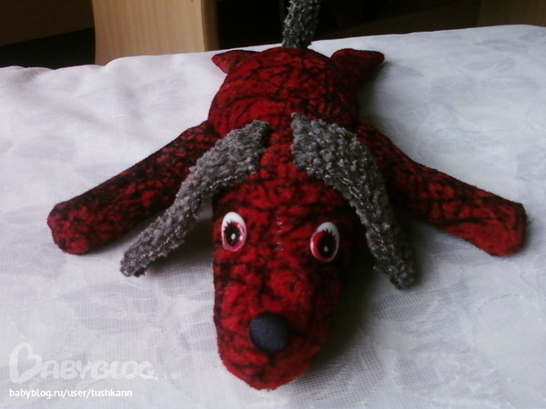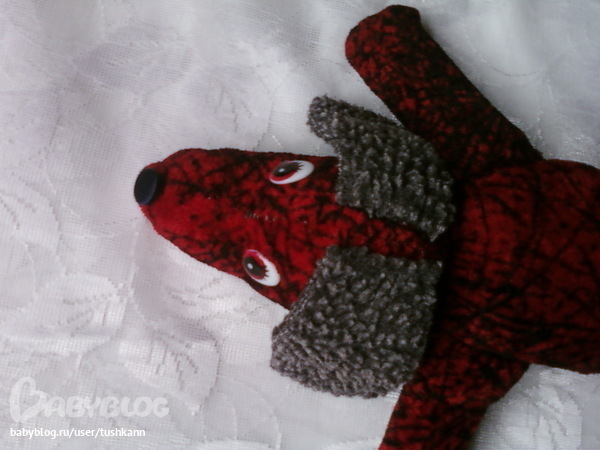 спасибо))) шьется она очень легко - тело и ножки - это прямоугольники, а голова - просто начертила силуэт головы сбоку, вырезала и сшила)))носик - пуговка, глазки от старой потрепанной игрушки оторвала))) шьется очень быстро, попробуй)))