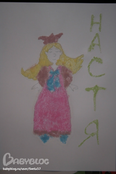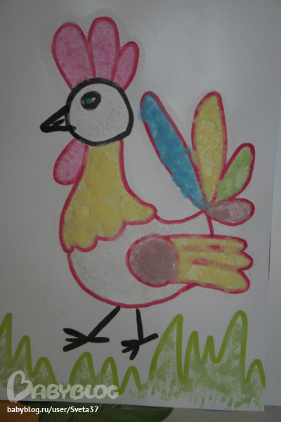 А это мы рисовали цветной солью. Соль насыпала в тарелку и растирала ее мелком. Потом смазывали рисунок клеем и засыпали солью.