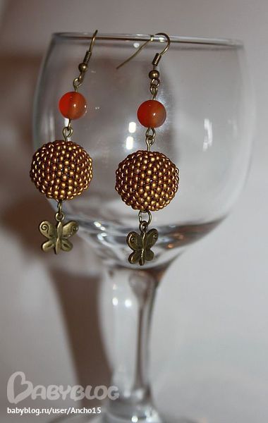 Серьги из бусин, оплетённых бисером, и натуральных камней - сердолика. А также подвеска в виде бабочки.