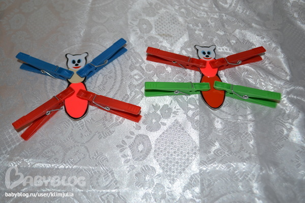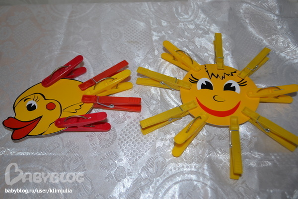 Вообще-то это для развития моторики и для изучения цвета. Солнышко (желтый круг) без лучиков, прищепками делаем их; тучке-дождик; бабочке-крылья; на дерево-листья; рыбке-хвост; ежику-колючки; петушку-перья;звездам-лучи. То есть ребенок должен прищипнуть прищепку чтобы закончить картинку
