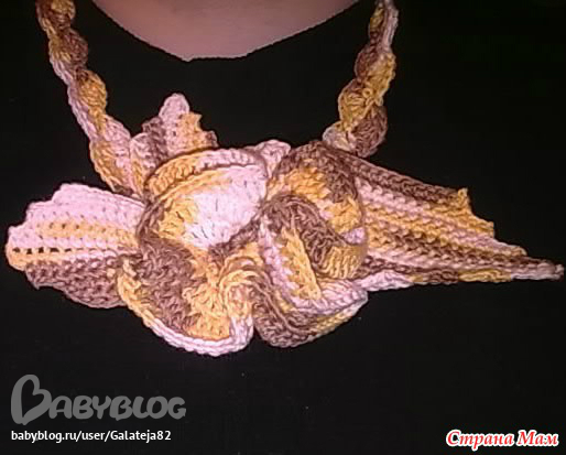 а вязала очень просто,цепочку воздушными петлями до нужной длинны,потом обвязыва с двух сторон веерками(5 ст.с/н в одну петлю,2 в.п. пропустить,1 полустолбик,2 в.п. пропустить,5 ст.с/н и так далее),потом отдельно листики и сам цветок,потом все это пришивала.