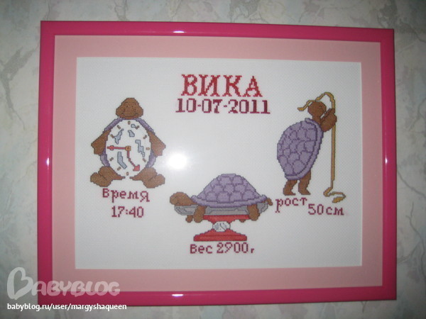 Спасибо! Я вышивала не долго , т.к. рука уже набита и нитки все подобраны заранее,несколько недель черепашек еще когда беременная была, цифры, дату и имя после родов, гуляла с коляска, доченька спала а я на скамеечка (как бабулька шила