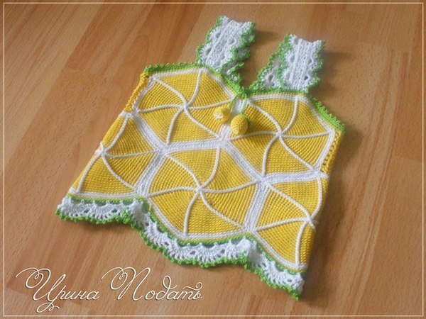 Ну вот и добрались руки связть что-то для своей лапочки-дочки=) Решила, что этим летом мы будем лимончиками! А прошлым были в клубничке. В планах еще беретик или панамочка и юбка обязательно. Но я не удержалась, что бы не похвастаться хотя бы маечкой. Вот.