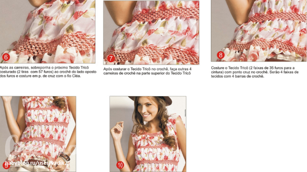 Вот такую интересную идею нашла в одном из журналов. Для создания такого нарядного воздушного топика вам нужно купить готовые полоски синтетики или нарезать ткань и обвязать крючком. Перед тем, как начать обвязку, вам нужно раскаленным тонким предметом проделать в полосках ткани дырочки. Важно, ткань должна быть именно СИНТЕТИЧЕСКАЯ!