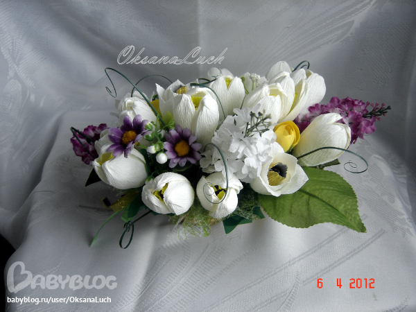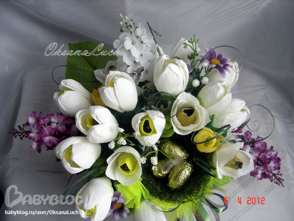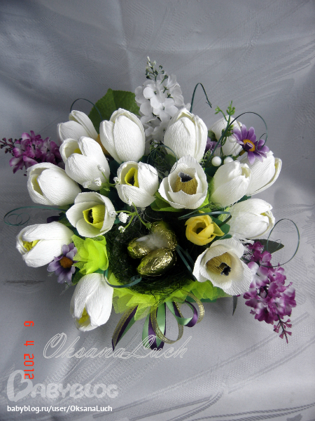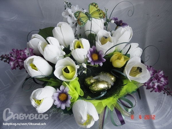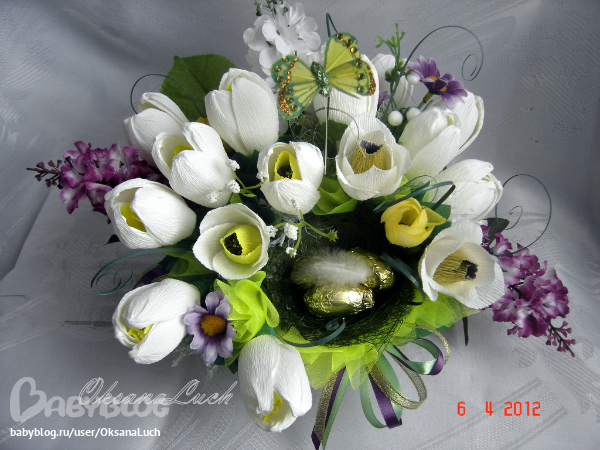 В твоем букетике можно попробовать посадить птичку. Полюби то, что ты сделала. Увидь в этом гармонию и весеннее пробуждение жизни, улыбнись солнышку. Еще раз полистай интернет, найди цвета твоей пасхи и сделай другую композицию...