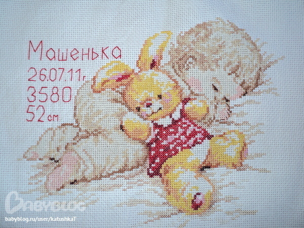 Вышивка очень хорошая, вот только имя и цифры лучше было разместить на большем расстоянии от ребеночка...помоему...