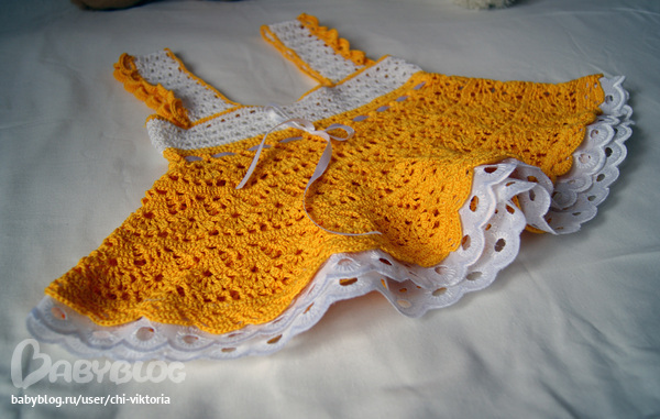 Я вязала из головы: кокетка - три столбика с накидом, воздушная петля и так далее, потом в шахматном порядке, а юбочку этим узором