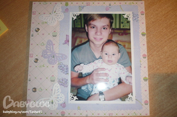 Таш, я бы надпись добавила, бабочку небольшую, какой-то детский элемент, а лучше сделать "композицию" в том углу, где бабочка или в верхнем - ну чтобы декор не размазаный по всей страничке был, а в одном месте, так интереснее получается. Т.е. взять крупный основной элемент (цветок, например), добавить несколько средних (пару бабочек разного размера, листики, детские элементы), и несколько мелких (пуговки, тычинки).