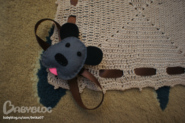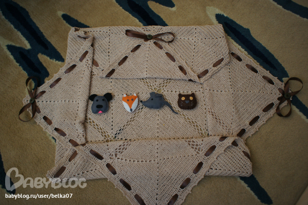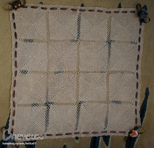 Доделала я плед, с вот такой изюминкой. Вяжеться из самых обычных квадратов, соединятся с помощью вязки воздушными петлями. Но в чем изюминка, у него по углам на пуговках 4 фетровые игрушечки. Которые можно отстегнуть и подвесить перед малышом или просто дать их пощупать.
