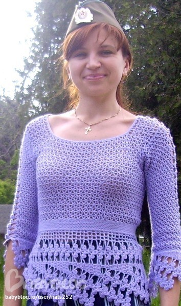 По-моему, она вяжется от пояса вверх, узор что-то типа: столбик с накидом, две воздушные, столбик с накидом в основание первого, снова столбик с накидом, но через две петли от основания предыдущей пары. А в следующем ряду делаете основание получившегося перевернутого треугольничка в точке пересечения нижних столбиков. Не знаю, понятно ли написала, могу нарисовать. В любом случае надо пробовать.