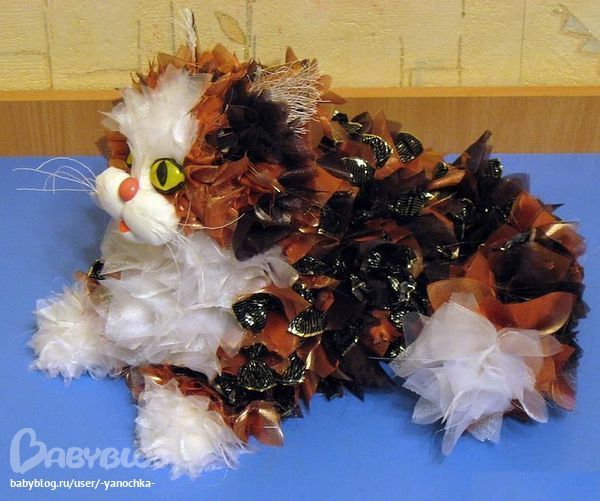 и я хотела эту кошку кинуть ))))) а зачем делать копию? можно же взять кусок пенопласта прямоугольный, прикрепить к нему с помощью шпажек 4 кусочка поменьше, один из которых примерно круглый. я так себе представляю. а потом форму кошки делать непосредственно с помощью фунтов и конфет.