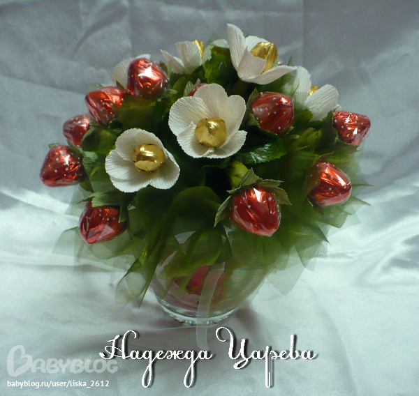 Надя все работы хороши. всё аккуратно , мило. поскажите во что обернули клубнички?сверху вижу слюду,а что под ней не пойму?спасибо.