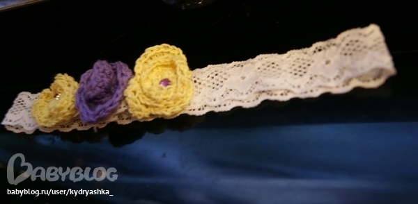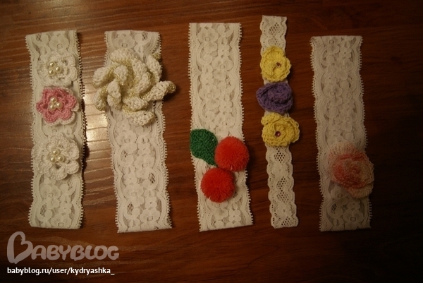 Предлагаю вам вот такие замечательные повязочки для маленьких принцесс ! Выполнены из эластичного кружева ( за счет чего очень хорошо облегают головку !) и украшены различными вязанными " штучками"