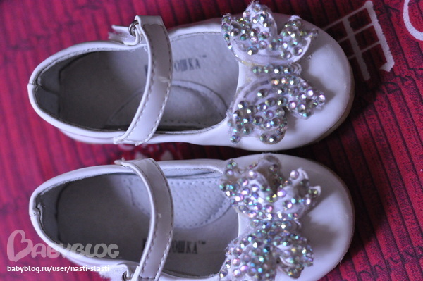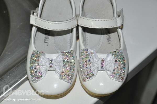 Достались нам по наследству туфельки, но декор мягко говоря был не в форме. Оторвала я бабочек и стразы, сделала бантики и наклеила старые стразы. На фото не видно, но они так красиво мерцают.