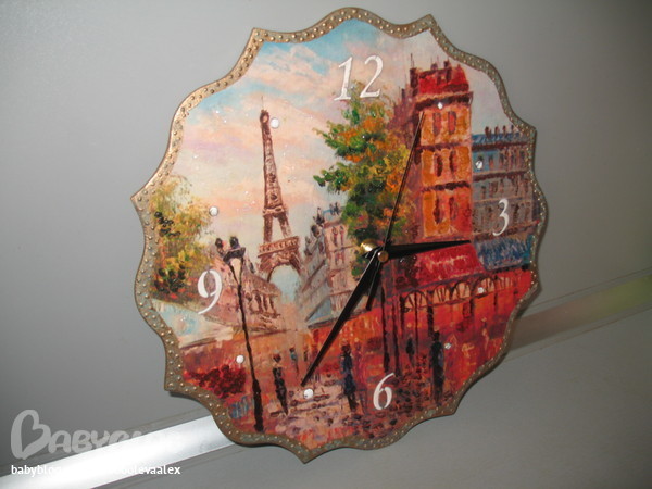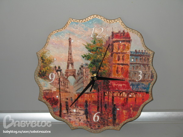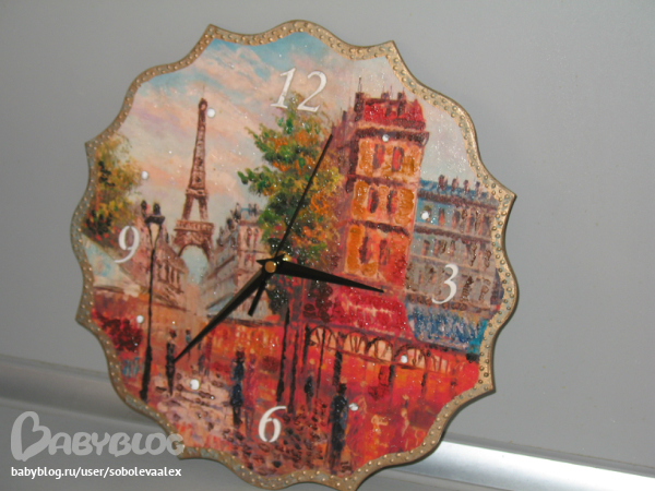 ДекупажЧасики мои сделаны были на конкурса "Часы.Календари. Хронометры" . мое первое первое место))) Часы выполнены в технике имитации живописи. Распечатка. гель для имитации, акриловые краски и лак.