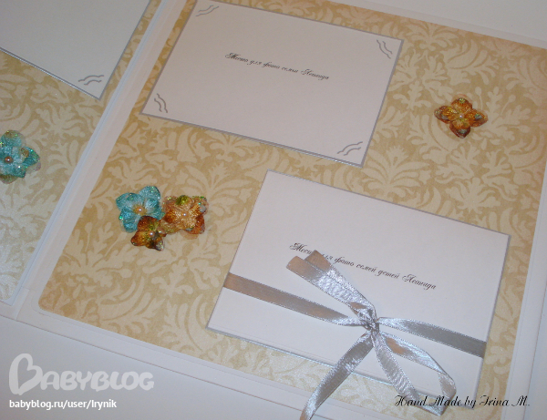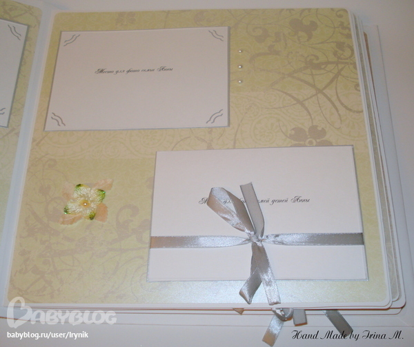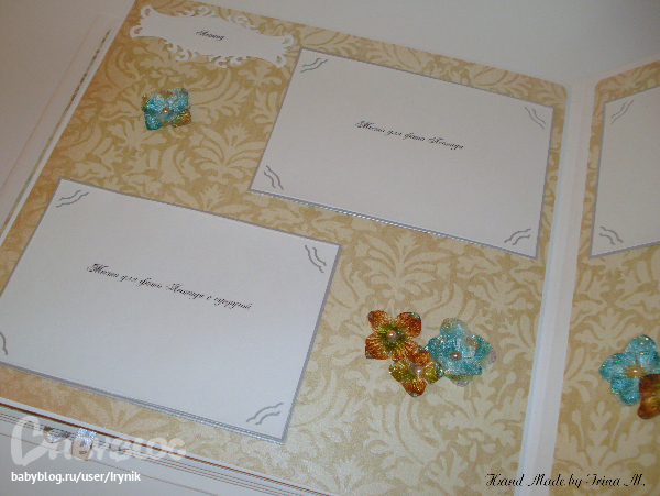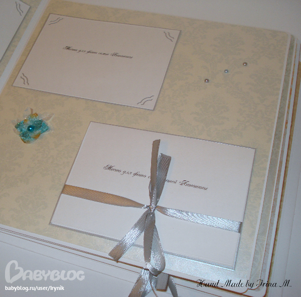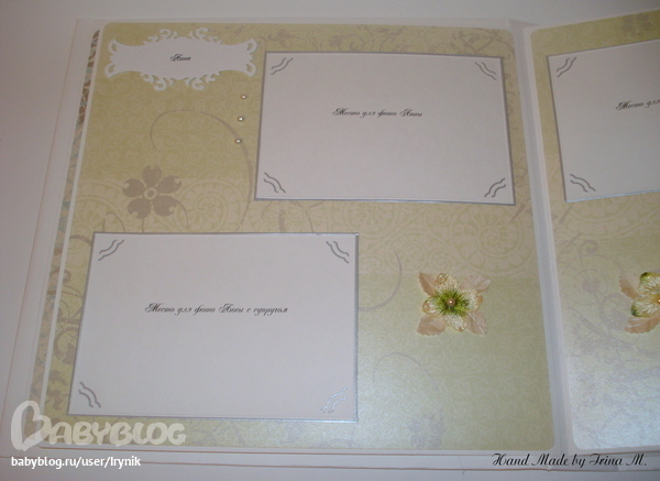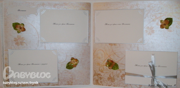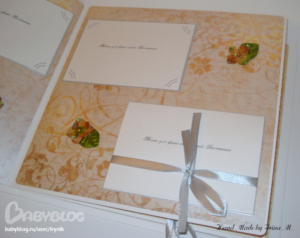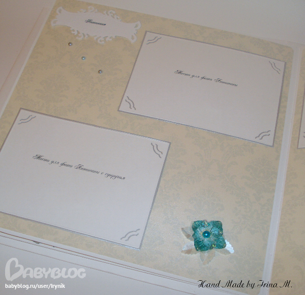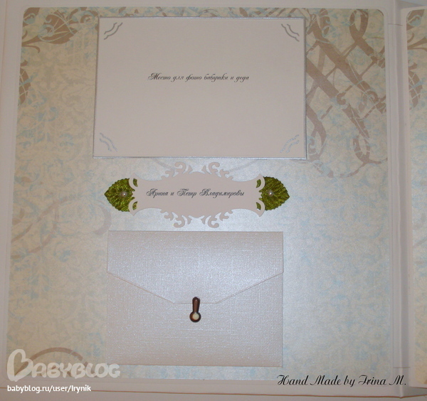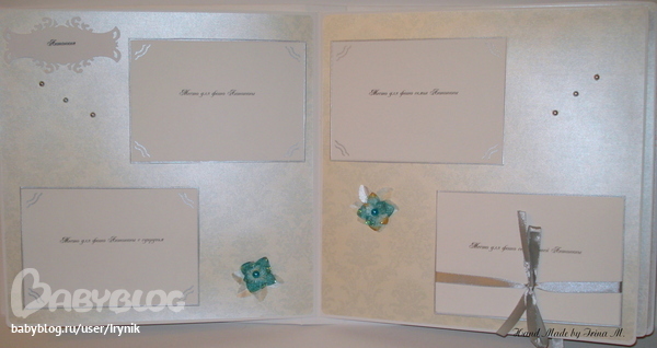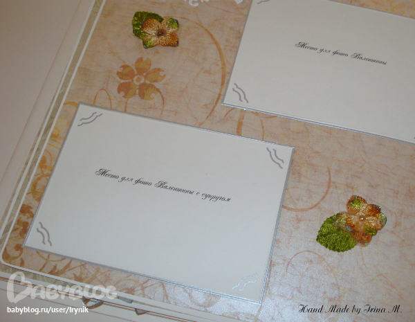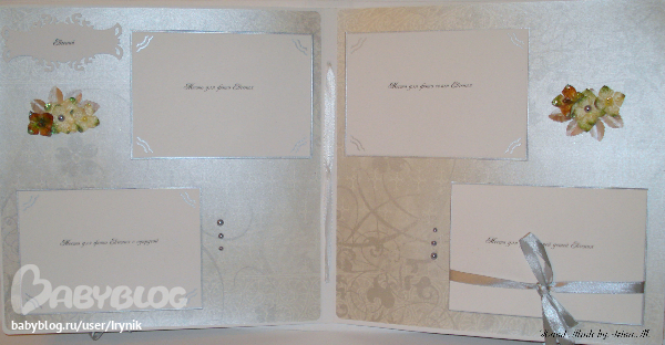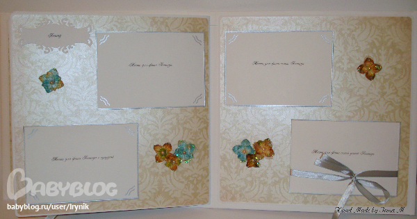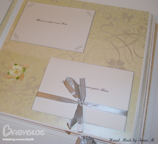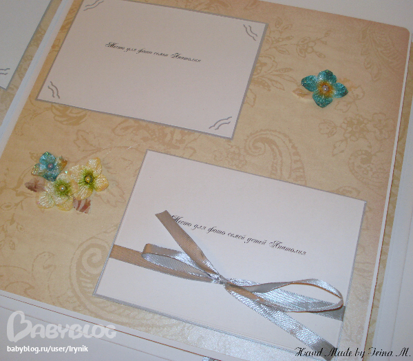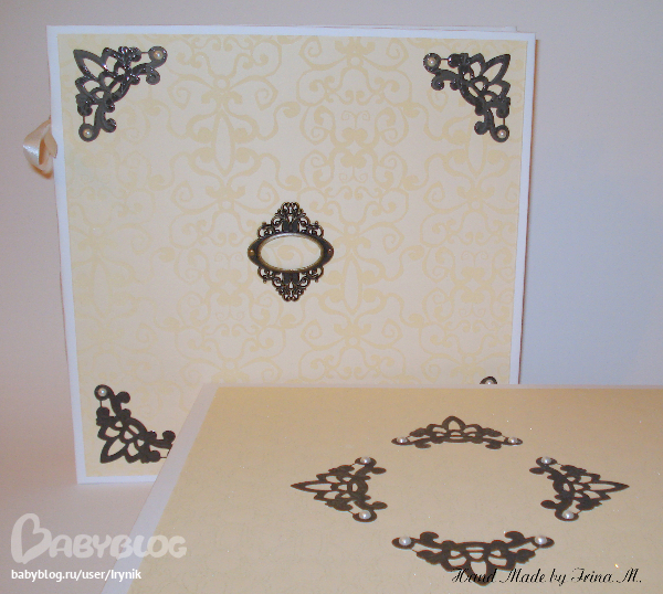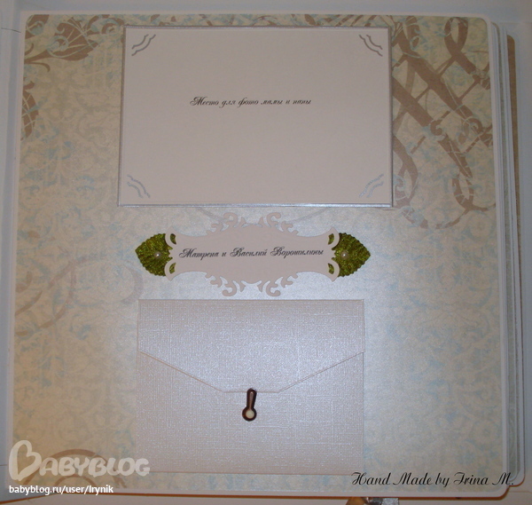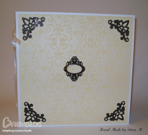 Было решено альбому название не давать...Обложка, украшена бархатной бумагой с лаковыми уголками и металлической рамочкой, что придает ему строгий, но в тоже время теплый вид...Внутри бумага на ощупь,как шелк, очень нежная и красивая, украшений по минимуму, что бы не прятать красоту бумаги...