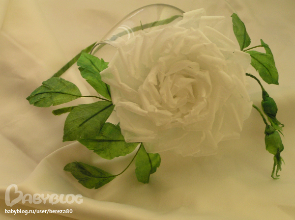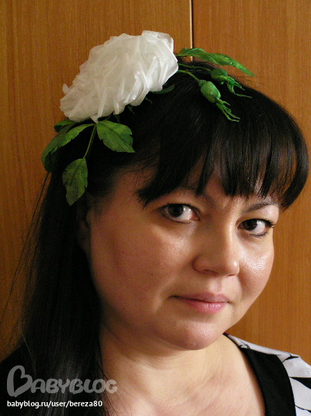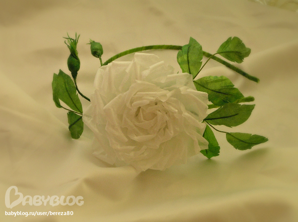 Очень нежная и красивая веточка!Красиво смотрится ободок,обмотанный зелёной ленточкой.Лена,позволь я с советом ,может так задуманно,но я бы у листьев сделала бы более частую гофрировку.В целом работа великолепная!