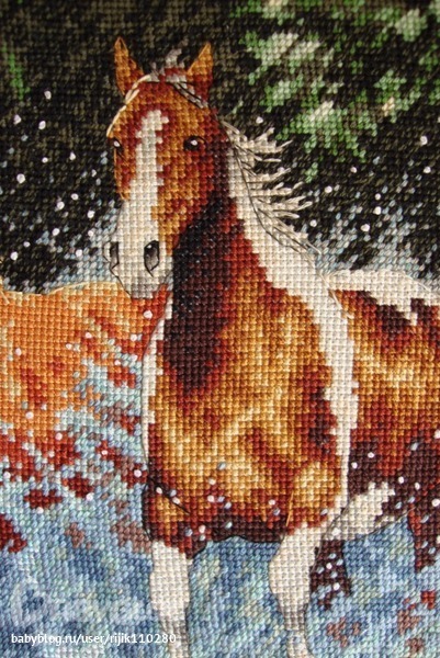 Набор Dimensions, китайской комплектации.46 х 25 см. В работе используется полный крестик, полукрест, крестик поверх крестика, бекстич, фран. узелки. Цветов 31, 12 смешанных , 1 люрекс. Схема на трех листах, проблем никаких не вызывает. Вышивала в течение 6 мес., по вечерам после работы, на выходных. В перерывах вышивала «Малыша» для подруги, всякую мелочь, без которой бы наверное гораздо быстрее справилась. Кони вышились быстро и с удовольствием, потом были кусты и темно-зеленый фон в шесть ниток, которые очень быстро закончились. Причем не хватало их довольно много, больше половины. Вышивала я очень экономно, так как уже был опыт с нехваткой ниток в китайском наборе. На воду тоже не хватило немного ниток пары цветов, но совсем немного. Сначала собиралась было заказывать недостающие нитки на сайте Дима, но потом передумала, слишком долго ждать бы пришлось, подобрала DMS. Не скажу, что вышивать было легко, особенно воду, но результат меня очень радует. Оформлять буду в ближайшее время, планирую деревянный багет, без паспарту. Спасибо, что дочитали мое длинное описание до конца))) Очень хотелось поделиться с вами свой радостью по поводу завершения долгой работы.