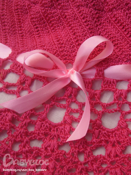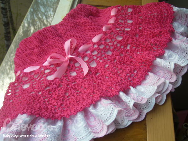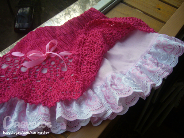В шитье я тоже профан, подъюбник мама шила. Подкладка х/б,рюша шитьё. Край, который соединяется с вязанной частью, обработан на оверлоке, сам подъюбник в форме трапеции, можно и прямоугольный, если он будет присоединяться к резинке, у меня он присоединен по линии ленточки и просто пристрочен нитками в тон.