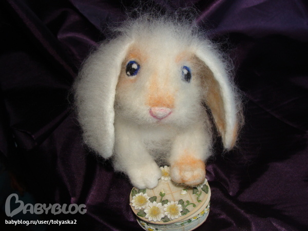 Фелтинг (валяние шерсти) Зайчик выполненв технике сухого валяния с применением игл с обратным ходом.