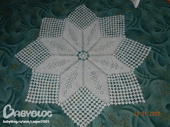 она вязана крючком из тонких ниточек, меленькие элементы связаны отдельно и потом в процессе вязки были соединены, могу покрупнее сфотать)))