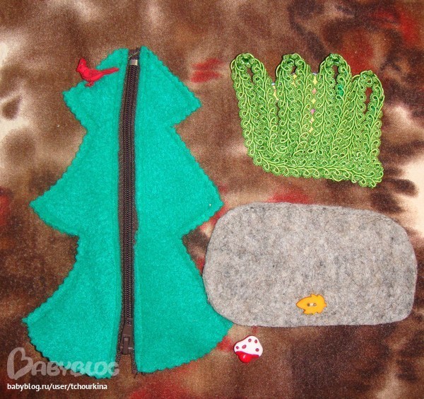 Елка из флиса с молнией. Куст из рельефной тесьмы. Берлога из шерстяного войлока. На полянке надо найти сову, зайку и медведя: