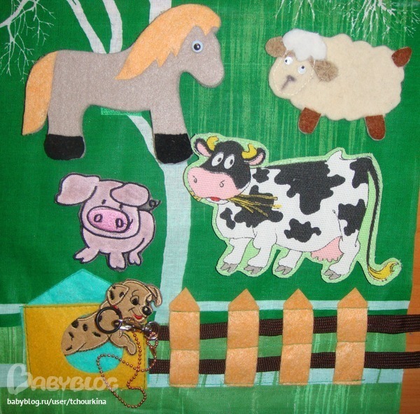 Лошадка из фетра, овечка - шерсть, свинка и собачка - аппликации, коровка из ткани. Все на липучках. Собачка на цепи, отстегивается, забор разбирается:
