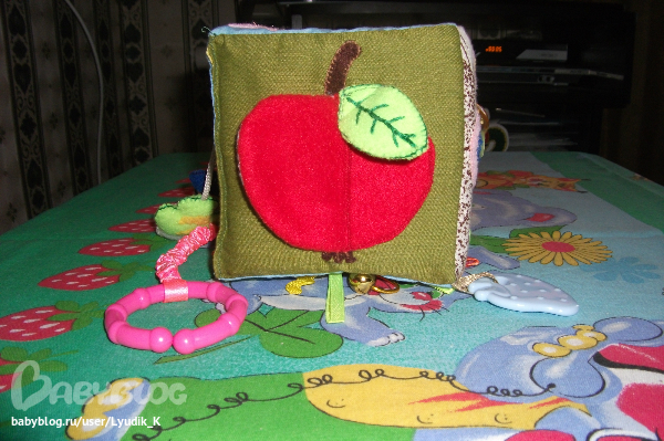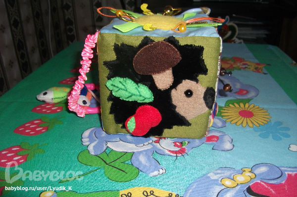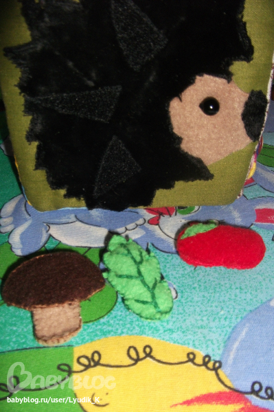 На первой грани ежик мягкое тельце..липучки в виде колючек на которые прикрепляется щелестящее яблочко,мягкий листок и грибок..