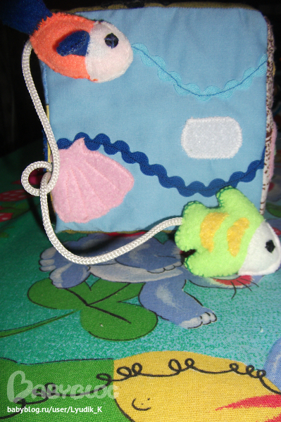 На пятой грани Морское дно с рыбками..Рыбки на веревочке оранжевая щелестит,а зеленая мягкая..они на липучках,и встроченая морская раковина.